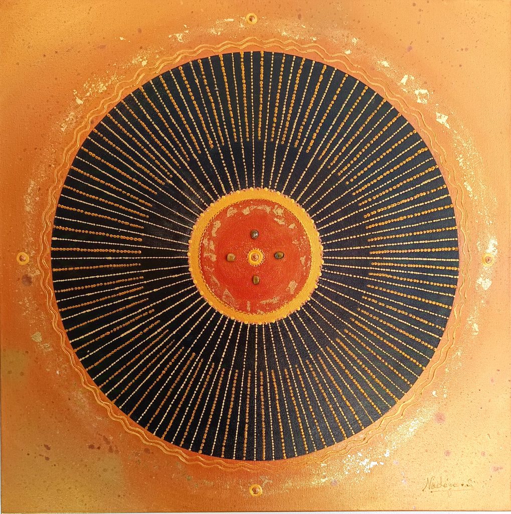 Un peu difficile à prendre en photo car tout en reflets bronze, cuivre et or. Comme bien souvent dans mes tableaux on peut y ressentir un mouvement d’expansion ou bien tout au contraire de concentration vers le centre.