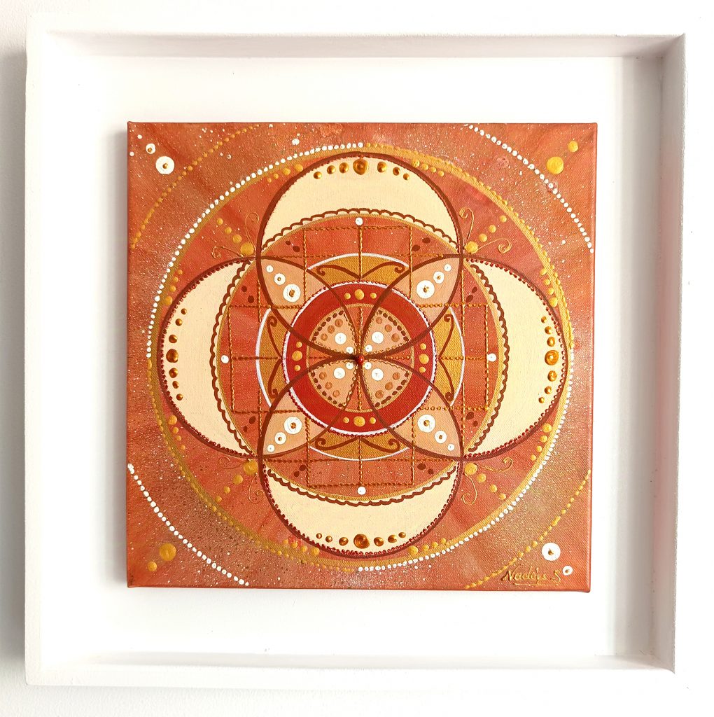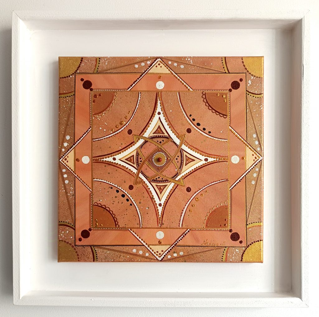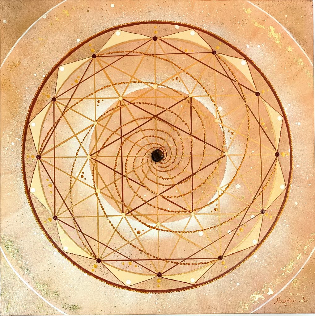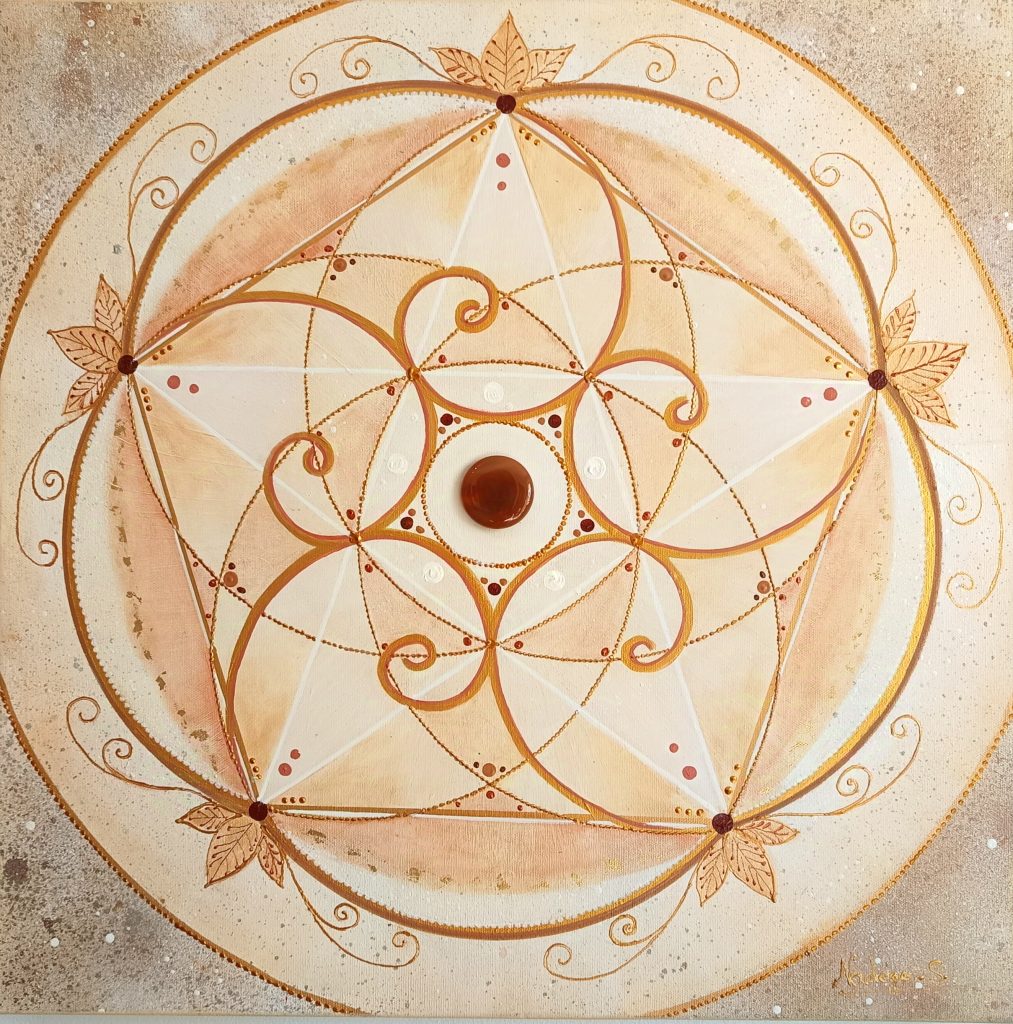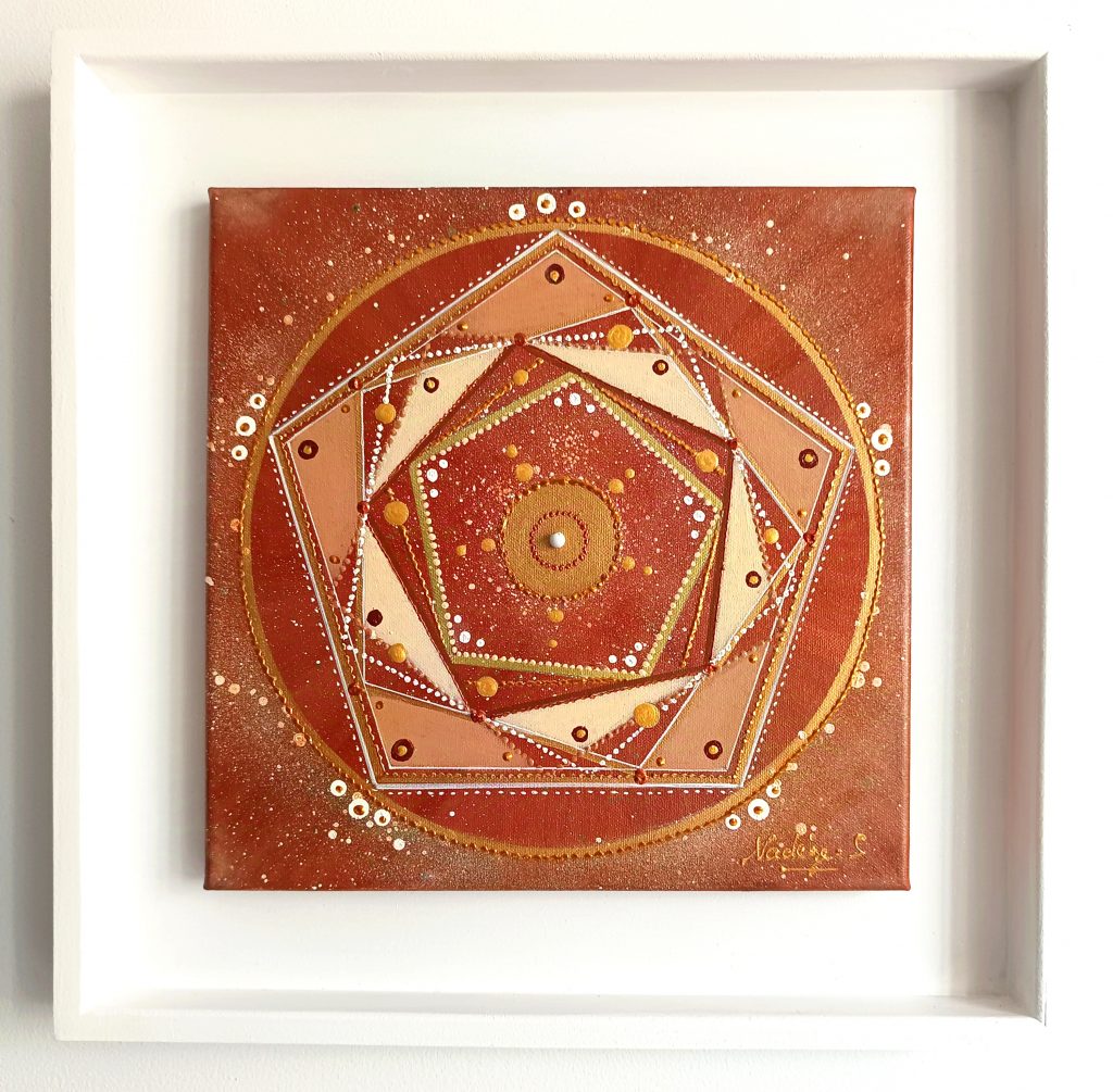 Un tableau tout en douceur, harmonie, équilibre et apaisement qu’apportent les couleurs et la géométrie sacrée du pentagone.