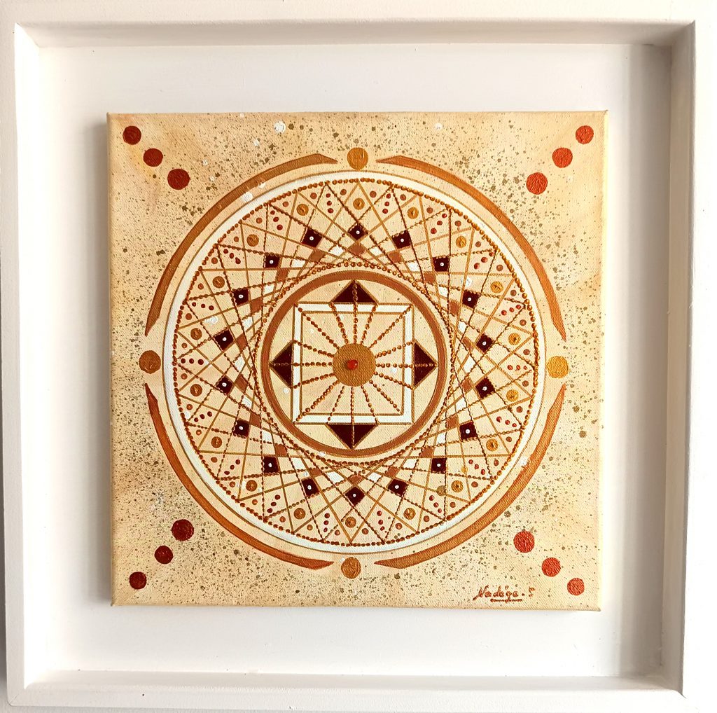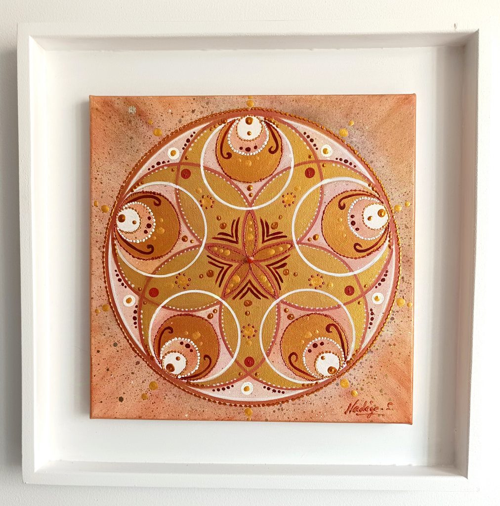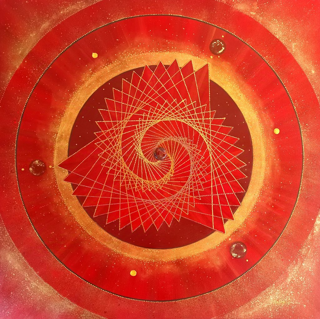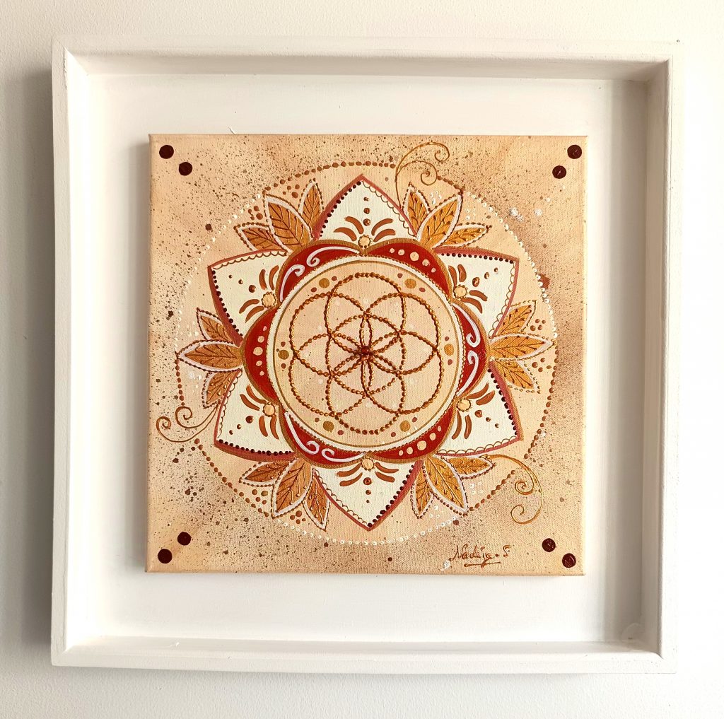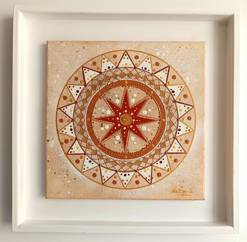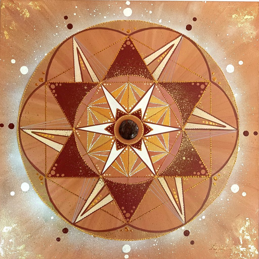 Un tableau tout en douceur, harmonie, équilibre et apaisement qu’apportent les couleurs et la géométrie sacrée du pentagone.